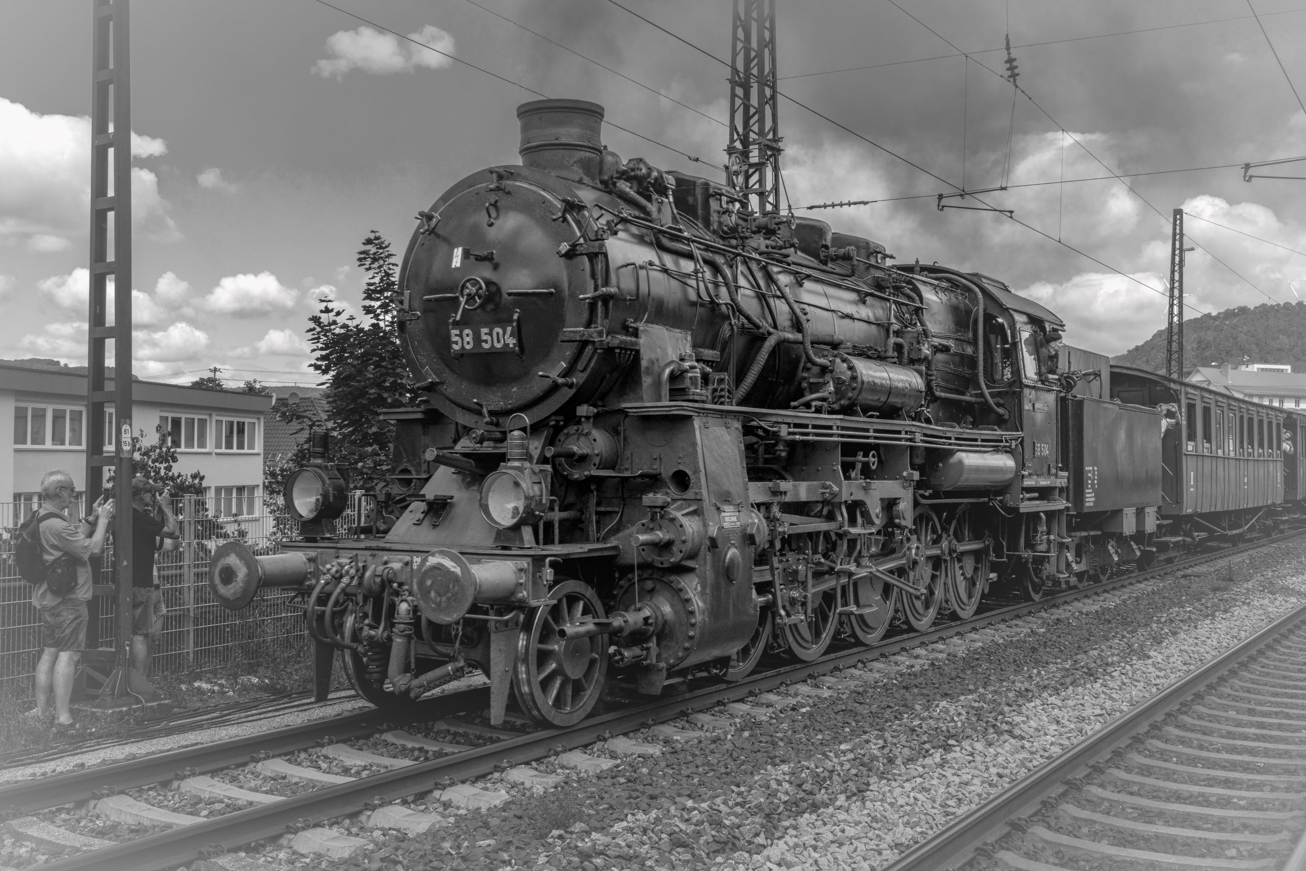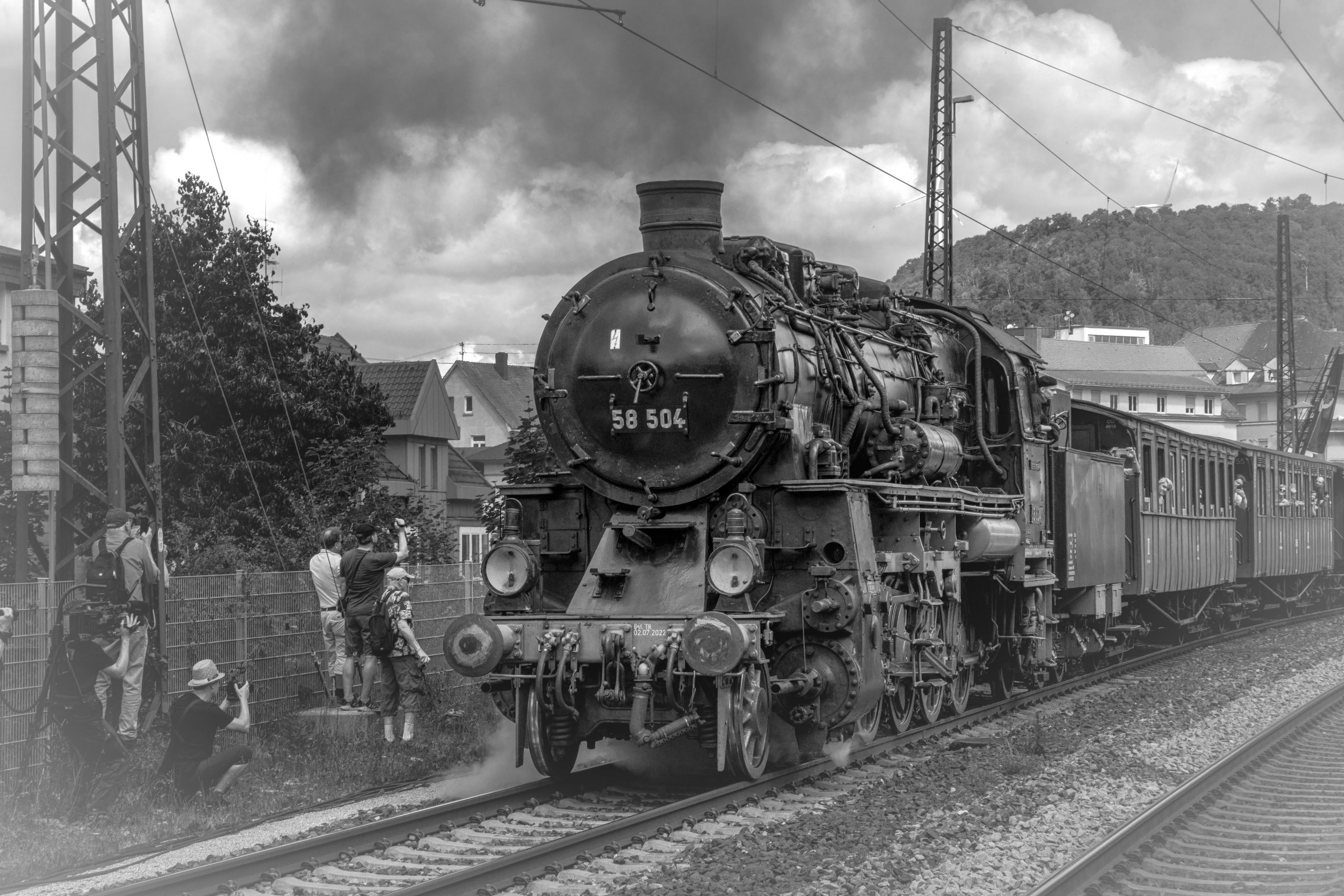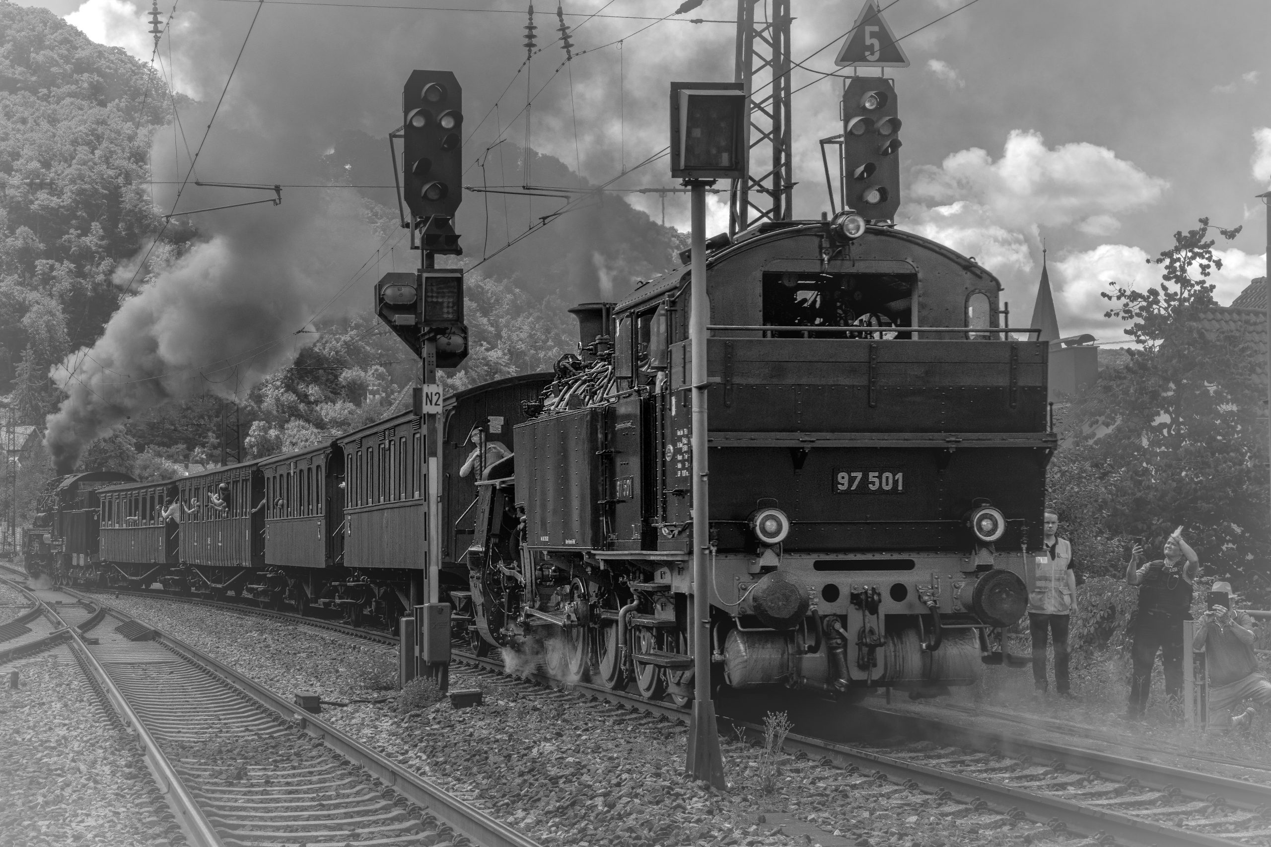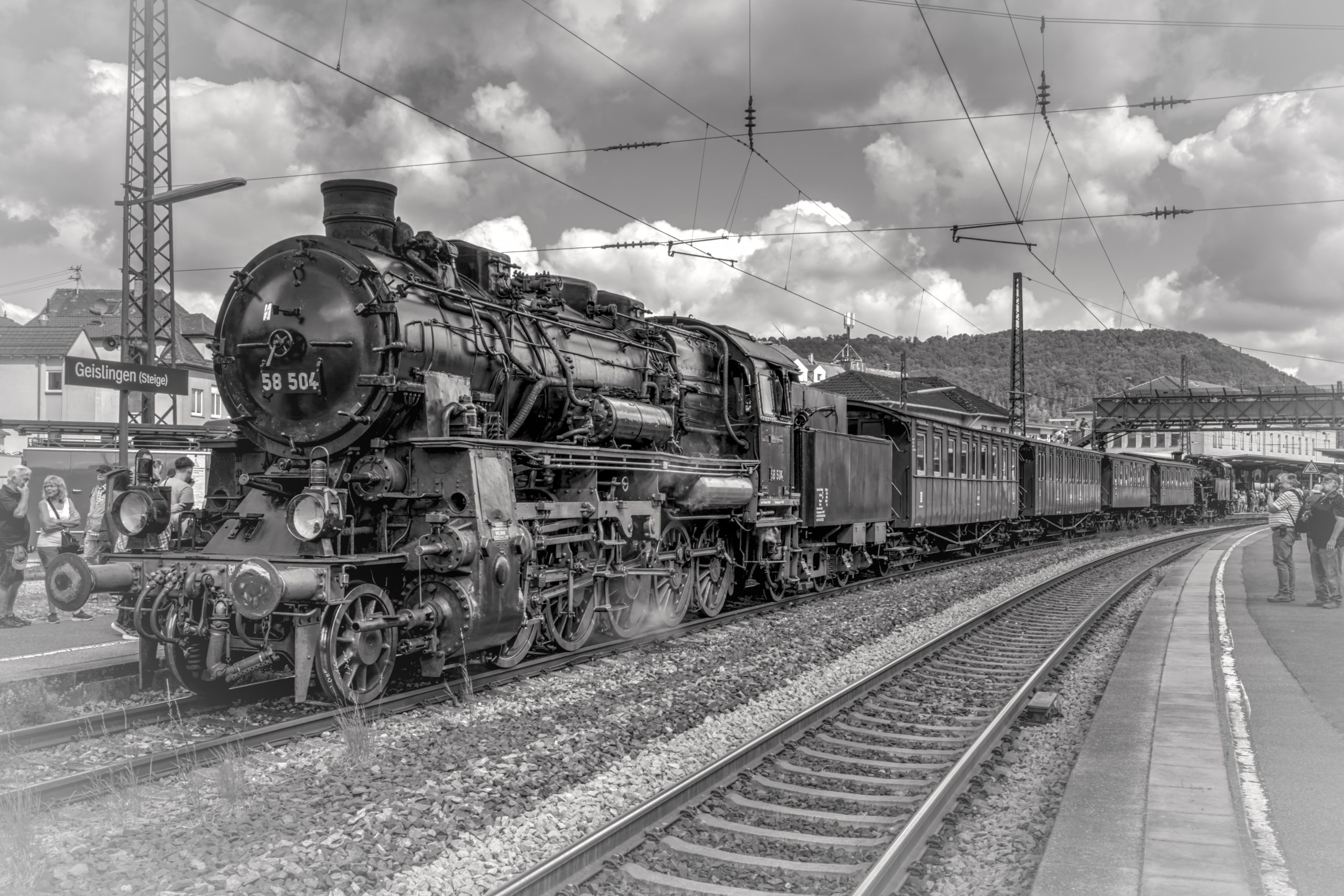Zum 175-jährigen Bestehen der Geislinger Steige ließen sich die 58 311 des Vereins Ulmer Eisenbahnfreunde e.V. und die 97 501 der ZHL – Freunde der Zahnradbahn Honau-Lichtenstein e.V. aus Reutlingen nicht lange bitten. Heute präsentierte sich die 58er übrigens als 58 504, geschmückt mit länderbahntypischen Stirnlampen. Zwei elegante Reisezüge warteten auf ihre Fahrgäste: einer mit württembergischen Personenwagen vom Kuckucksbähnel, der andere aus Donnerbüchsen zusammengestellt.