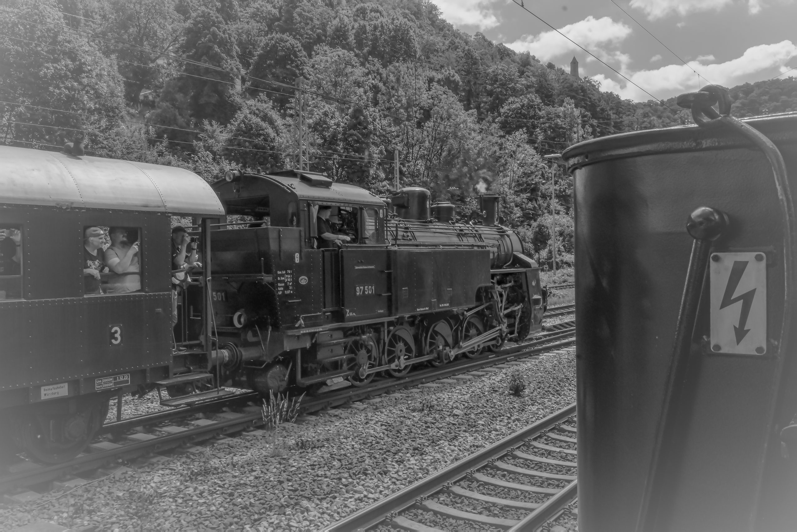 Zur Mittagszeit fuhren zwei Züge parallel: Wir saßen im Zug der 58er mit den württembergischen Wagen, die 97er zog mit den Donnerbüchsen und der 1020 als Schiebelok auf dem Nachbargleis. Meinen Platz auf der Bühne gleich hinter dem Tender musste ich während der gesamten Bergfahrt tapfer verteidigen.