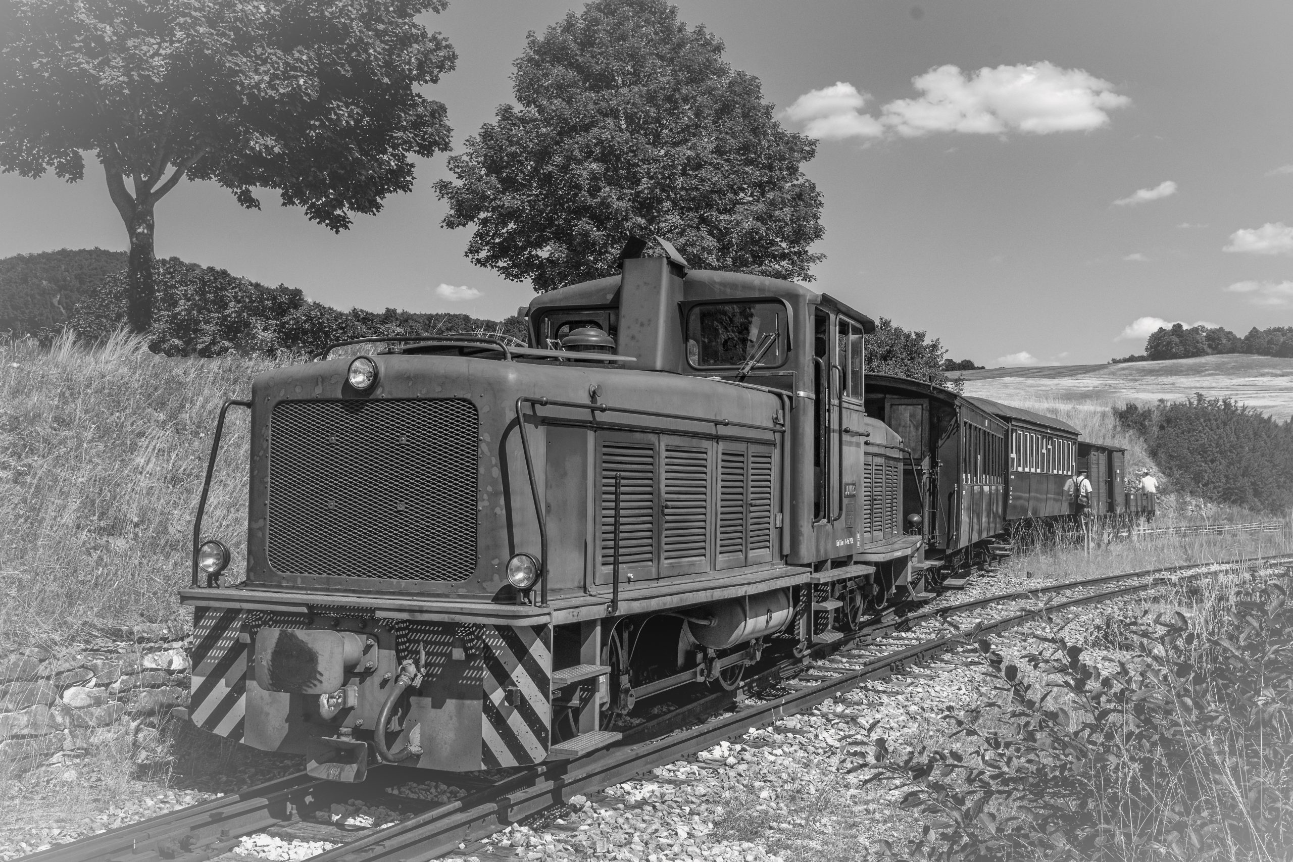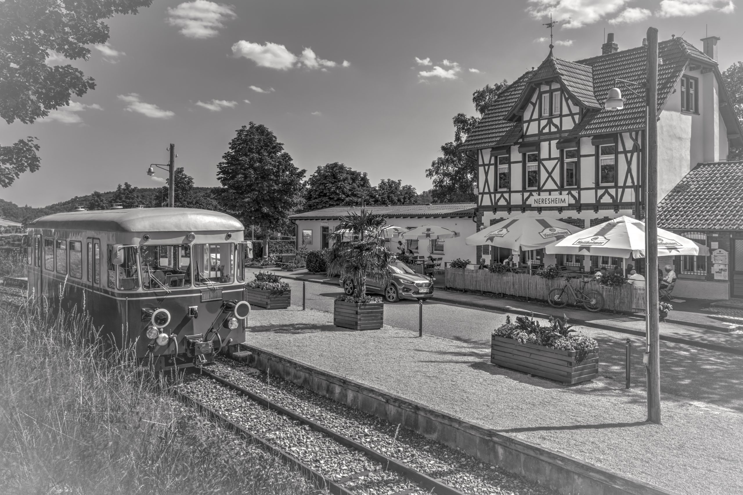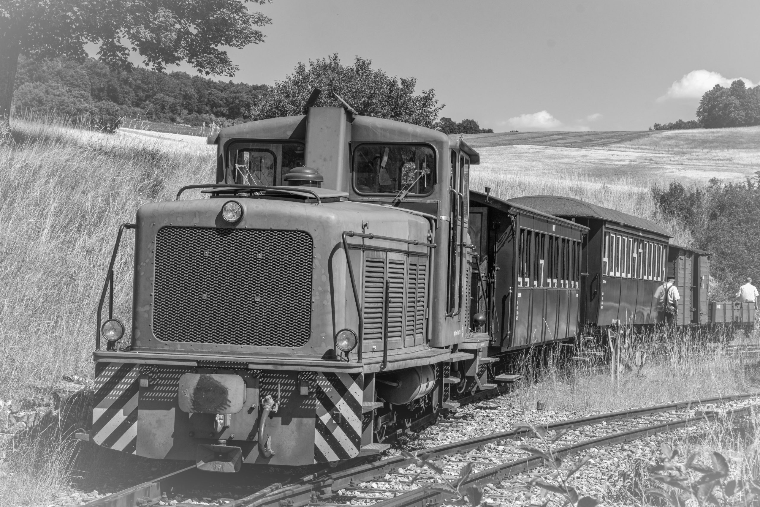 Während wir im Biergarten unsere Vorräte auffüllten, erlebten wir an diesem Tag ein kleines Spektakel: Das Härtsfeld-Krokodil rollte heran, gezogen von einer Diesel-Gelenklok, begleitet von einem gemischten Personenzug und dem Triebwagen T33, einem Hanseat, der früher auf der Kleinbahn Bremen-Tarmstedt unterwegs war.