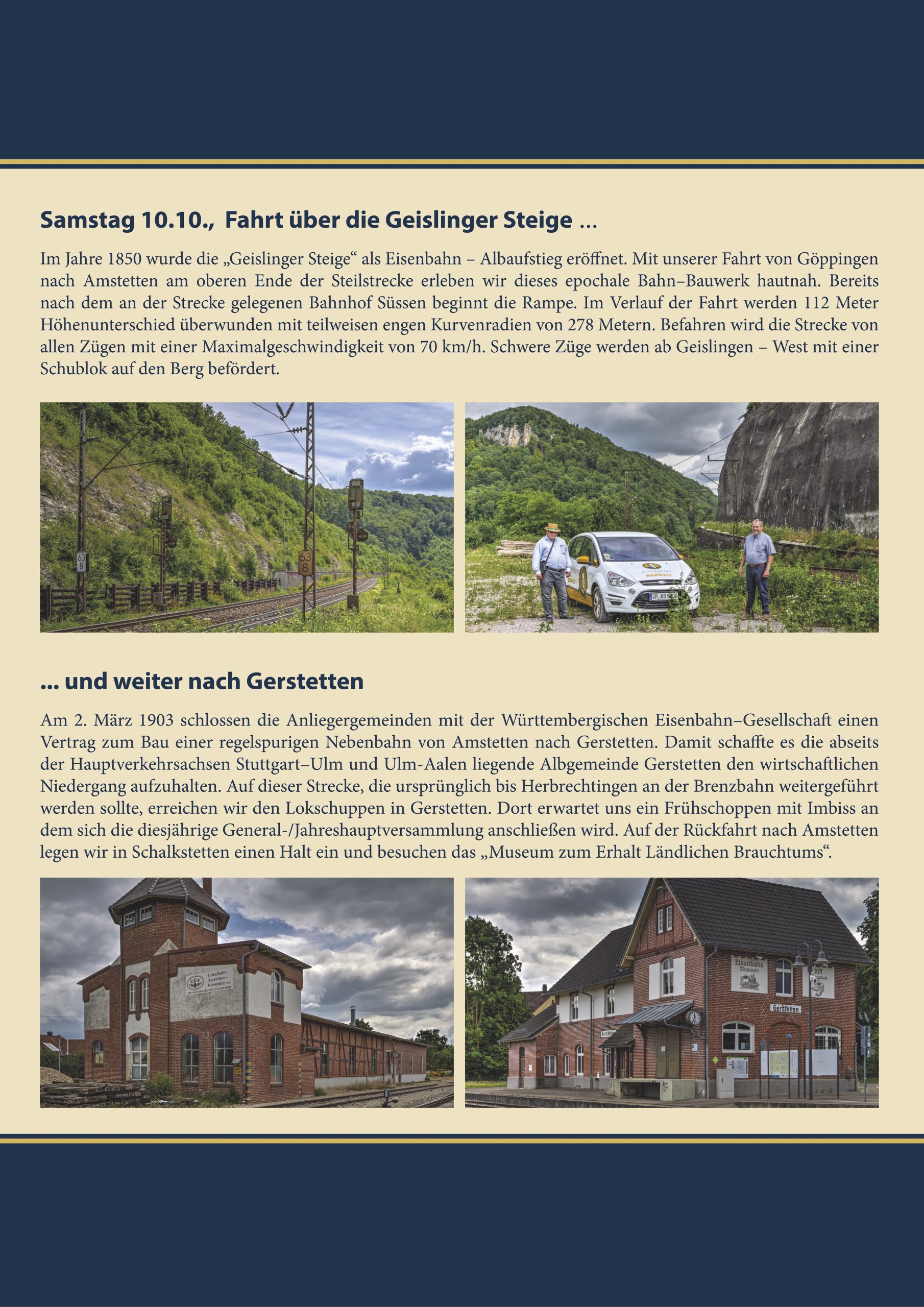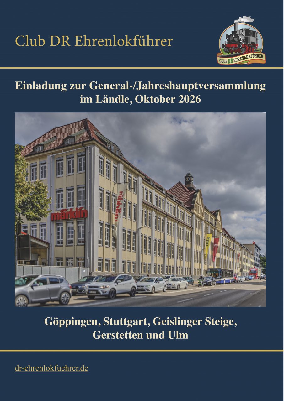 - Viaggio in treno attraverso la Geislinger Steige, ben nota a tutti i ferrovieri, fino ad Amstetten e poi con la ferrovia locale fino a Gerstetten, visita alle strutture operative degli amici della ferrovia di Ulm e pranzo leggero, assemblea generale/assemblea annuale nel deposito locomotive di Gerstetten, ritorno a Göppingen e conclusione della serata alla locanda “Andechser”;