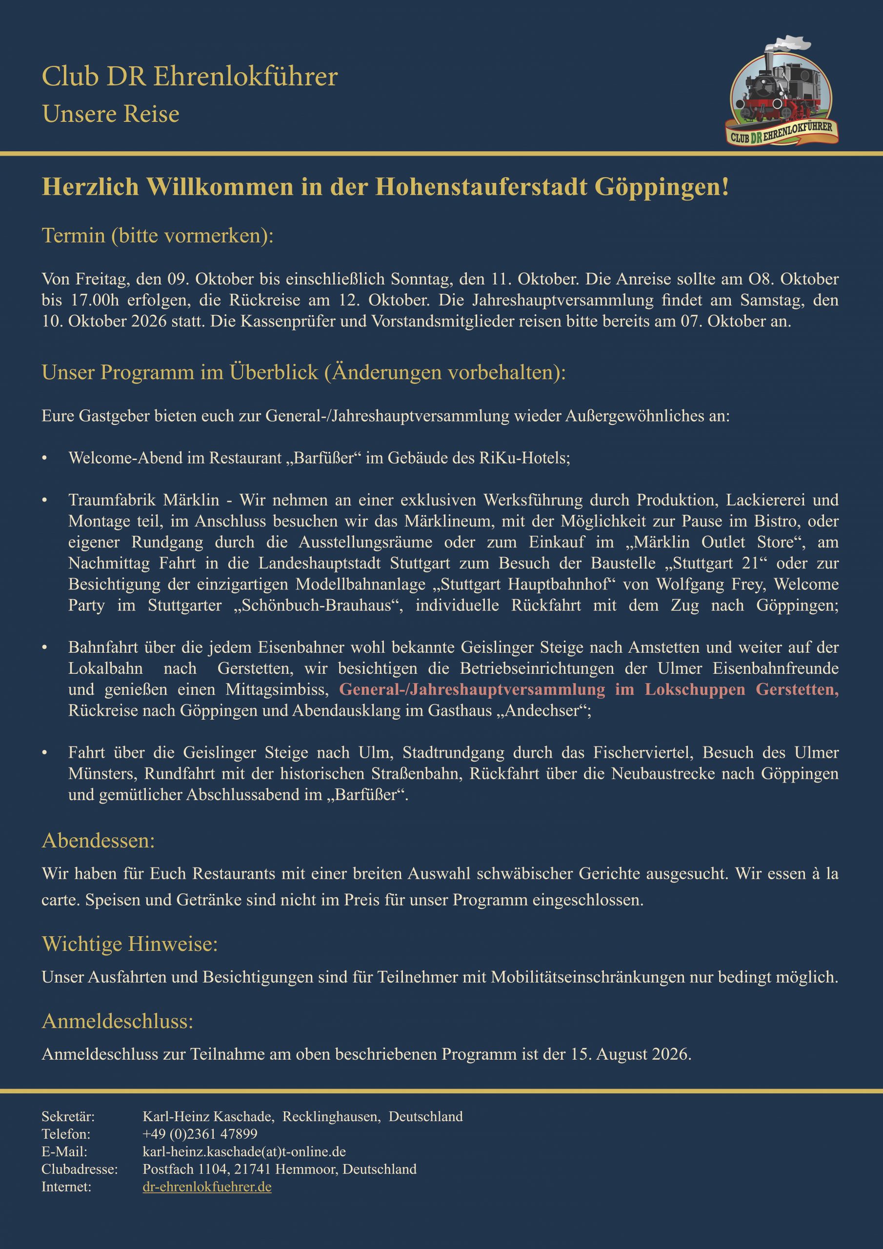 Die Anreise sollte am O8. Oktober bis 17.00h erfolgen, die Rückreise am 12. Oktober. Die Jahreshauptversammlung findet am Samstag, den 10. Oktober 2026 statt. Die Kassenprüfer und Vorstandsmitglieder reisen bitte bereits am 07. Oktober an.