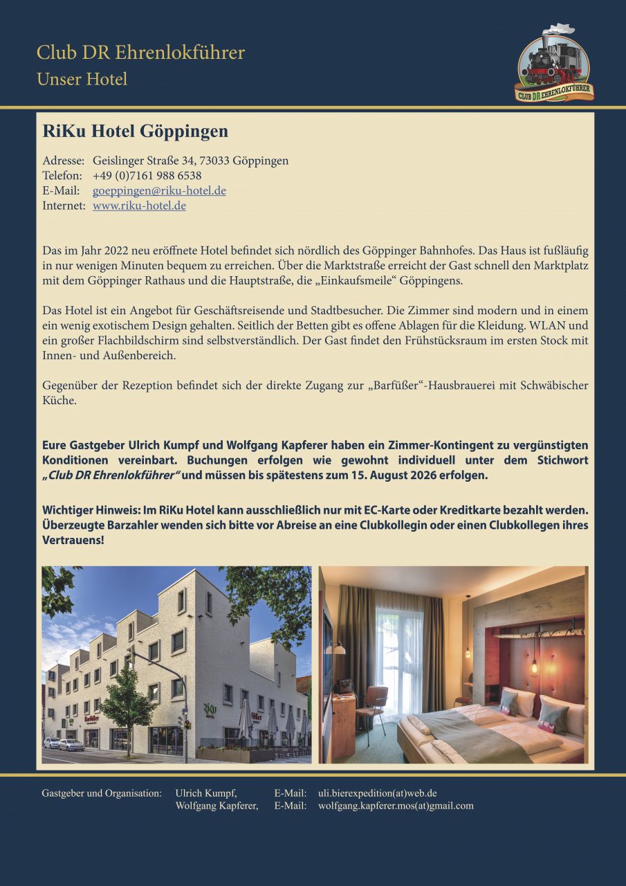 I vostri ospiti Ulrich Kumpf e Wolfgang Kapferer hanno concordato un contingente di camere a condizioni agevolate. Le prenotazioni devono essere effettuate come di consueto individualmente con la dicitura “Club DR Ehrenlokführer” ed entro e non oltre il 15 agosto 2026.