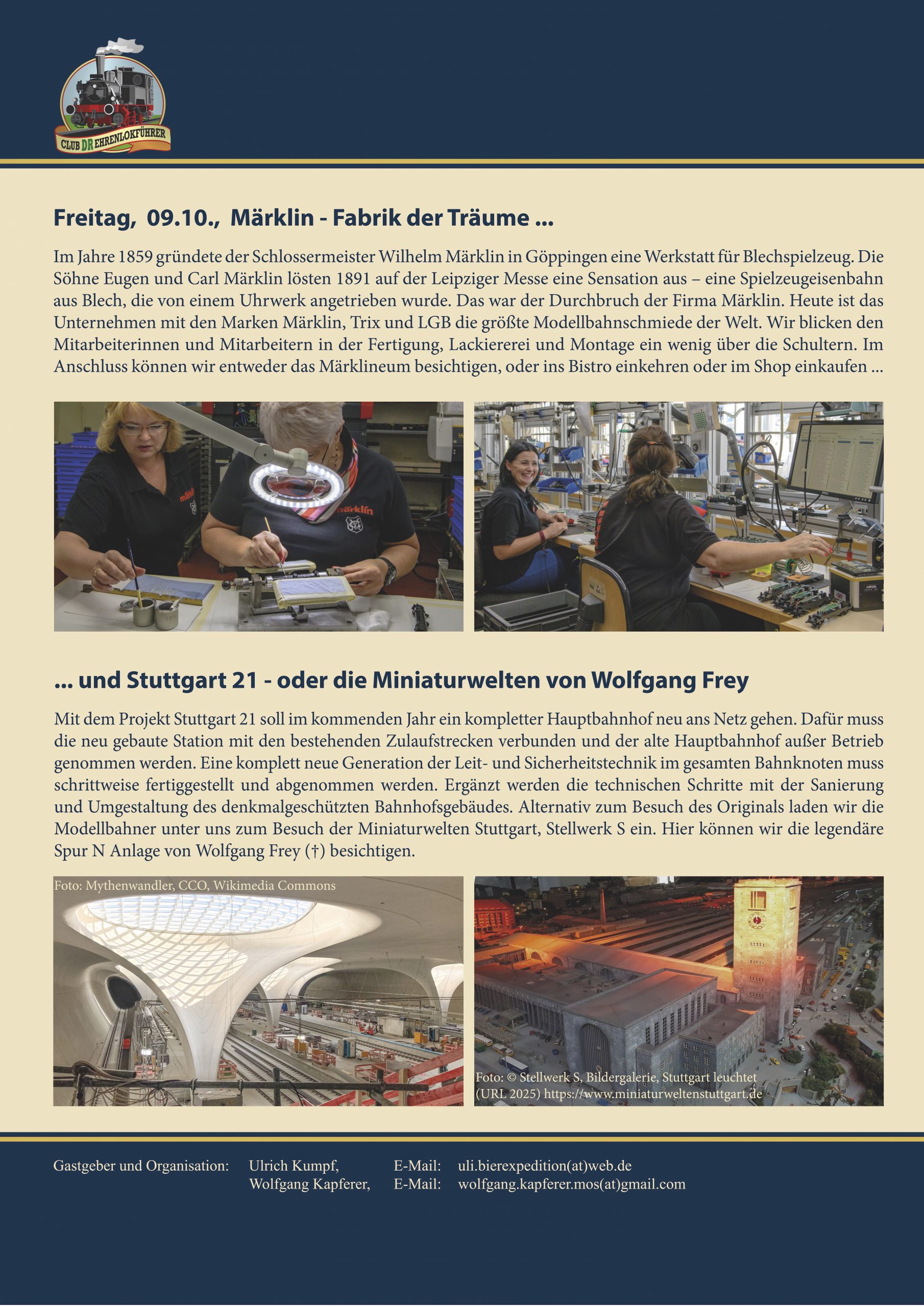 - Traumfabrik Märklin – Wir nehmen an einer exklusiven Werksführung durch Produktion, Lackiererei und Montage teil, im Anschluss besuchen wir das Märklineum, mit der Möglichkeit zur Pause im Bistro, oder eigener Rundgang durch die Ausstellungsräume oder zum Einkauf im „Märklin Outlet Store“, am Nachmittag Fahrt in die Landeshauptstadt Stuttgart zum Besuch der Baustelle „Stuttgart 21“ oder zur Besichtigung der einzigartigen Modellbahnanlage „Stuttgart Hauptbahnhof“ von Wolfgang Frey, Welcome Party im Stuttgarter „Schönbuch-Brauhaus“, individuelle Rückfahrt mit dem Zug nach Göppingen;