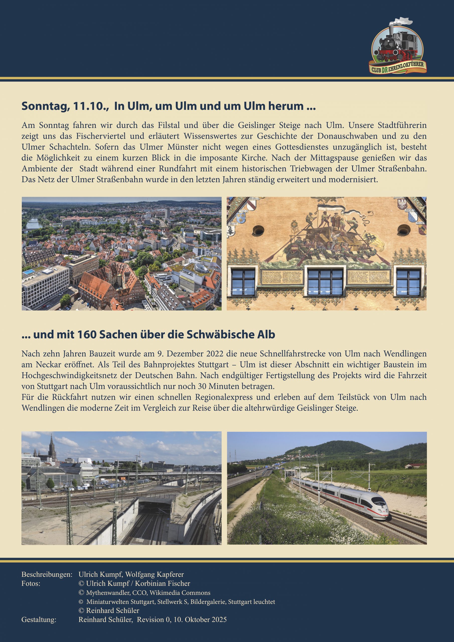 - Fahrt über die Geislinger Steige nach Ulm, Stadtrundgang durch das Fischerviertel, Besuch des Ulmer Münsters, Rundfahrt mit der historischen Straßenbahn, Rückfahrt über die Neubaustrecke nach Göppingen und gemütlicher Abschlussabend im „Barfüßer“.